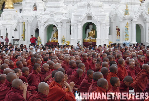 9月24日,在緬甸的仰光,僧侶們參加示威游行。緬甸仰光市數萬名僧侶和市民當天走上街頭,舉行近期最大規(guī)模的示威游行。此次示威是自18日以來,仰光僧侶游行的最新升級行動,也是市民首次較大規(guī)模參與的示威游行。游行的標語口號是:改善民生、釋放政治犯、實現民族和解等。 新華社/路透