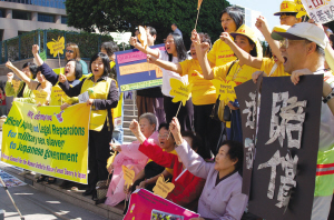 臺灣婦女救援社會福利事業(yè)基金會國際事務(wù)部主任賴采兒一行人專程從臺灣趕來參加示威以及研討會。手舉“臺灣阿媽要求日本政府謝罪賠償”牌子的賴采兒說,許多曾經(jīng)被迫充當(dāng)“慰安婦”的阿媽都已超過90高齡,因身體虛弱、行動不便而無法來美參加本次活動。她說,臺灣目前健在的“慰安婦”大約有25名。