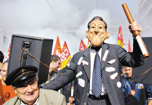 法國(guó)罷工工人戴著薩科齊面具上街抗議。
