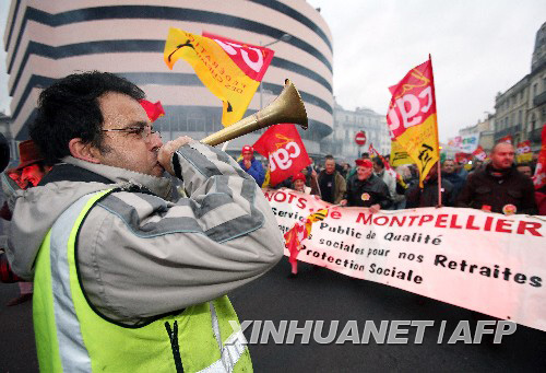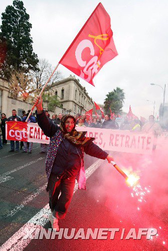 11月20日,在法國(guó)蒙彼利埃,一名女子揮舞法國(guó)總工會(huì)的旗幟參加游行。法國(guó)八大公務(wù)員聯(lián)合會(huì)當(dāng)日發(fā)起預(yù)定24小時(shí)的罷工,將已經(jīng)持續(xù)一周的法國(guó)大罷工推入新階段。這次公務(wù)員罷工的目的是要求政府增加工資,并抗議政府作出的2008年取消2.29萬(wàn)公務(wù)員職位的決定。 新華社/法新