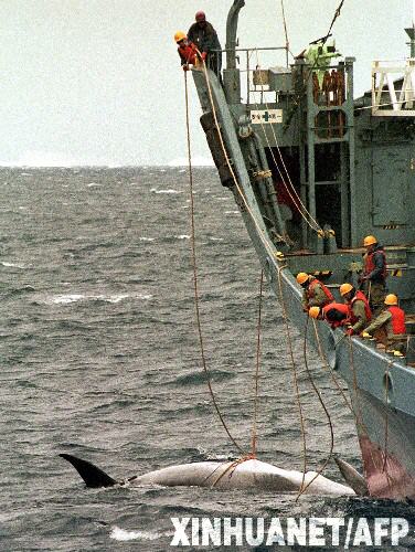 日本政府定于18日開始今年的南太平洋捕鯨活動。同往年一樣,日本依舊打起“科學研究”的旗號,但在今年捕殺名單中,座頭鯨赫然在列。這將是國際捕鯨協(xié)會1963年禁止在南半球捕殺座頭鯨以來,首次有國家大規(guī)模捕殺這一瀕危物種。這是2000年1月12日,日本捕鯨船在南太平洋海域捕獲小須鯨的資料照片。 新華社/法新