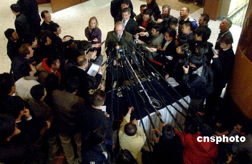 十二月五日,美國助理國務(wù)卿希爾結(jié)束對朝鮮的訪問抵達(dá)北京,在其下榻的酒店接受記者采訪。 中新社發(fā) 廖攀 攝