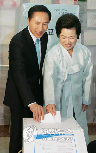 李明博夫婦在投票。(韓聯(lián)社圖片)