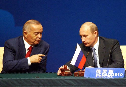 烏茲別克斯坦總統(tǒng)卡里莫夫(左)與俄羅斯總統(tǒng)普京交談。