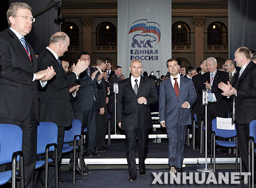 12月17日,在俄羅斯首都莫斯科,俄總統(tǒng)普京(中左)與第一副總理梅德韋杰夫(中右)共同步入統(tǒng)一俄羅斯黨代表大會(huì)會(huì)場(chǎng)。普京當(dāng)日表示,如果梅德韋杰夫當(dāng)選總統(tǒng),他準(zhǔn)備出任政府總理。 新華社發(fā)