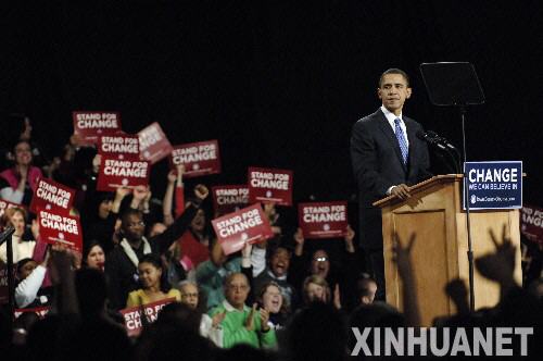 1月3日,伊利諾伊州國會(huì)參議員、民主黨人奧巴馬在艾奧瓦州得梅因舉行的總統(tǒng)選舉首場(chǎng)預(yù)選中獲勝后發(fā)表演說。
