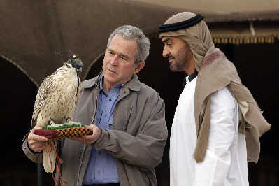 1月13日,阿聯(lián)酋,到訪的美國總統(tǒng)布什和阿聯(lián)酋王儲扎耶德·阿勒那哈揚在皇家俱樂部賞玩獵鷹。