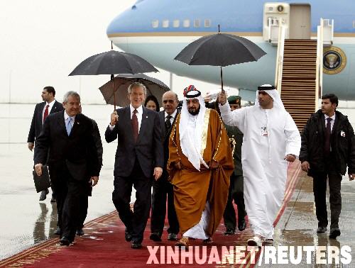 1月13日,阿聯(lián)酋總統(tǒng)哈利法(中)在阿布扎比迎接剛剛抵達(dá)的美國總統(tǒng)布什(左二)。布什當(dāng)天上午抵達(dá)阿布扎比,開始對阿拉伯聯(lián)合酋長國進(jìn)行為期兩天的訪問。阿聯(lián)酋是布什此次中東之行的第五站。 新華社/路透