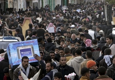 據(jù)“中央社”報道,埃及邊境衛(wèi)隊并未采取行動。埃及總統(tǒng)穆巴拉克說,他告訴邊界官員,“讓他們(加沙人)進來,找東西吃或是購買食物,只要他們沒帶武器,就讓他們回去”。興高采烈的加沙人民涌向埃及邊界的拉法鎮(zhèn),購買香煙、燃料,以及其它因為當(dāng)?shù)剡B月遭到封鎖而變得稀有的物品。