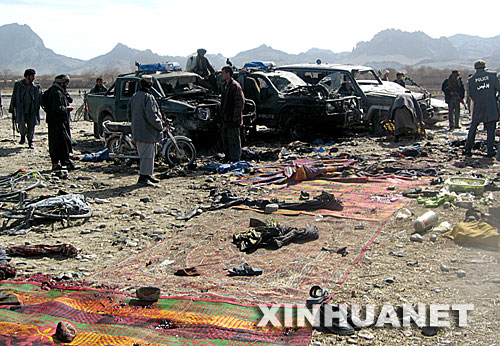 2月17日,警察和路人在阿富汗南部坎大哈市的爆炸襲擊現(xiàn)場(chǎng)查看?泊蠊∈¢L(zhǎng)阿薩杜拉·哈立德說(shuō),當(dāng)天上午發(fā)生在坎大哈市一個(gè)斗狗場(chǎng)的爆炸是自殺式襲擊事件,已經(jīng)造成至少80人死亡。 新華社/法新