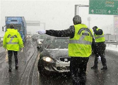 希臘警察在雪中疏導(dǎo)交通。