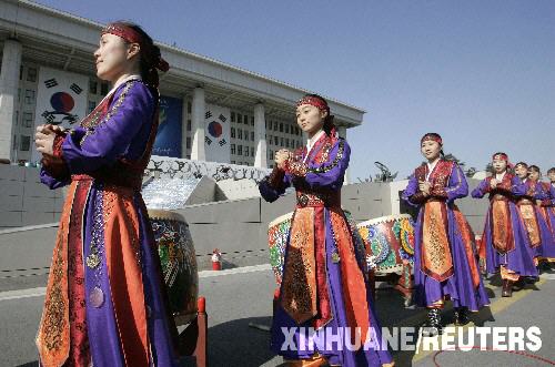 2月24日,在韓國首都首爾,身穿韓國傳統(tǒng)服裝的演員為新總統(tǒng)就職典禮進行彩排。韓國當選總統(tǒng)李明博將于2月25日參加就職典禮,正式成為新一任韓國總統(tǒng)。 新華社/路透
