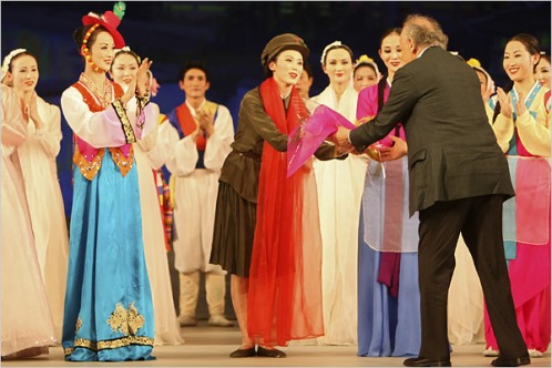 美國(guó)紐約愛(ài)樂(lè)樂(lè)團(tuán)音樂(lè)總監(jiān)兼指揮馬澤爾與朝鮮演出人員在一起。