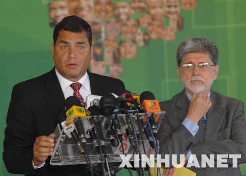 3月5日,厄瓜多爾總統(tǒng)科雷亞(左)在巴西利亞舉行記者會?评讈啽硎荆蚬隙酄栂M乐迖医M織能夠盡快行動,組成一個調(diào)查委員會調(diào)查由于哥倫比亞軍隊進入厄瓜多爾境內(nèi)打死哥反政府組織領(lǐng)導(dǎo)人所引發(fā)的外交危機。