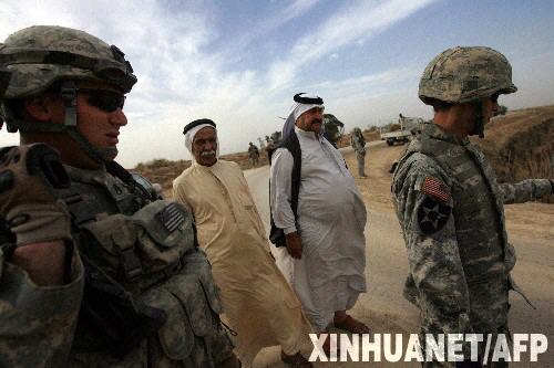 3月10日,在伊拉克迪亞拉省一個(gè)村莊的郊外,當(dāng)?shù)夭柯涫最I(lǐng)和美軍士兵查看一處路上埋有簡(jiǎn)易爆炸裝置的地點(diǎn)。駐伊拉克美軍當(dāng)日宣布,5名美軍士兵當(dāng)天在巴格達(dá)遭遇炸彈襲擊身亡。 新華社/法新