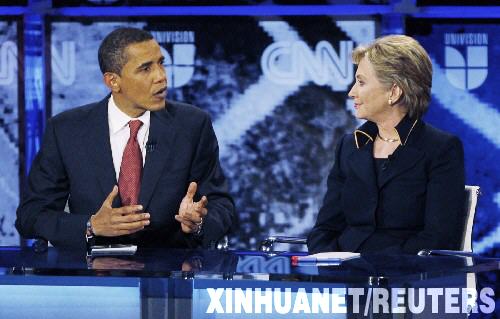 2月21日,美國民主黨總統(tǒng)競選人奧巴馬(左)和希拉里在奧斯汀的得克薩斯大學(xué)參加競選辯論。 新華社/路透