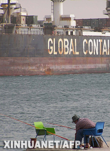 3月25日,在埃及伊斯梅利亞港口附近,一名埃及人在蘇伊士運河中航行的美軍“全球愛國者”號旁釣魚。