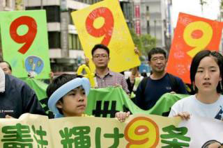 5月3日在日本憲法紀念日,民眾在東京舉行大游行,手持標語主張維護和平憲法第九條規(guī)定。