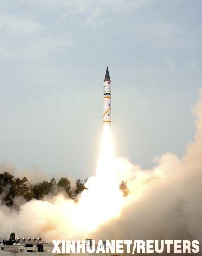 5月7日,印度在東部奧里薩邦附近的惠勒島發(fā)射一枚“烈火-3”型導(dǎo)彈。當(dāng)天,印度成功試射了這枚自行研發(fā)的遠程導(dǎo)彈。據(jù)印度政府說,它能夠攜帶核彈頭擊中3000公里以外的目標。 新華社/路透