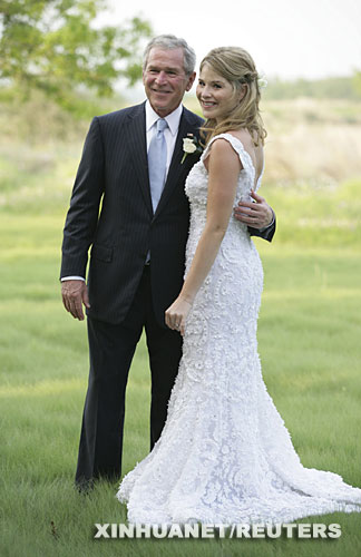 這張5月11日由白宮發(fā)布的照片顯示的是,5月10日,美國(guó)總統(tǒng)布什和女兒詹娜在婚禮前合影。10日傍晚,布什總統(tǒng)的愛女詹娜在美國(guó)得克薩斯州克勞福德農(nóng)場(chǎng)舉行露天婚禮,與交往已久的男友黑格共結(jié)連理。 新華社/路透