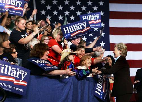當(dāng)?shù)貢r間20日,美國民主黨參選人希拉里在肯塔基州與支持者握手。
