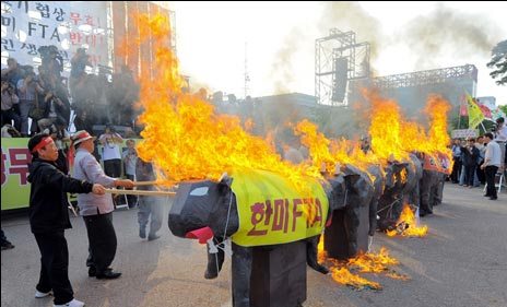 上百名游行示威者在首爾市中心燭光守夜,抗議李明博政府恢復進口美國牛肉,漠視民眾對瘋牛病的擔心。警察隨即驅(qū)散游行者,并以非法占用街道需接受審訊為由逮捕了37名拒絕驅(qū)散者。