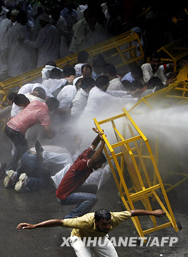 6月1日,在印度首都新德里街頭,警察用水槍驅(qū)散參加抗議的古賈爾人。近期,拉賈斯坦邦古賈爾人要求調(diào)低自己的種姓級別,以便從政府的傾斜政策中獲取更大利益。但政府對此予以拒絕。過去一周,該邦古賈爾人發(fā)動大規(guī)?棺h活動并與警察發(fā)生沖突。5月31日,聲援印度拉賈斯坦邦古賈爾人的活動擴大到印度東北部地區(qū)。 新華社/法新