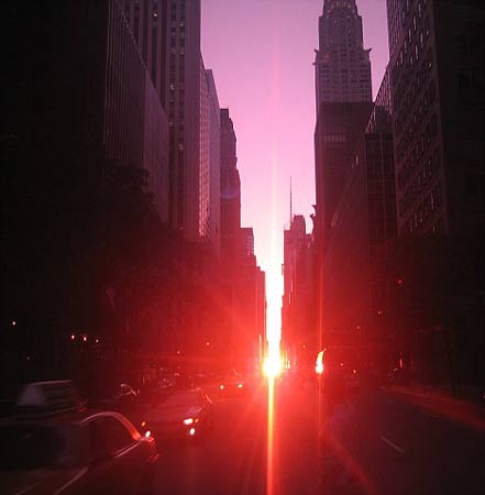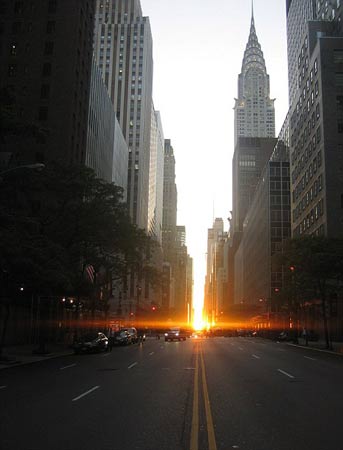 據(jù)報(bào)道,該景觀一年僅有兩次,而且還不是年年都有,整個(gè)紐約不夜城便沐浴在陽光下。在“曼哈頓懸日”出現(xiàn)的這幾天里,當(dāng)太陽落下時(shí),在紐約曼哈頓地區(qū)的格網(wǎng)街道的排列形式就如同巨大石柱群布局一樣。