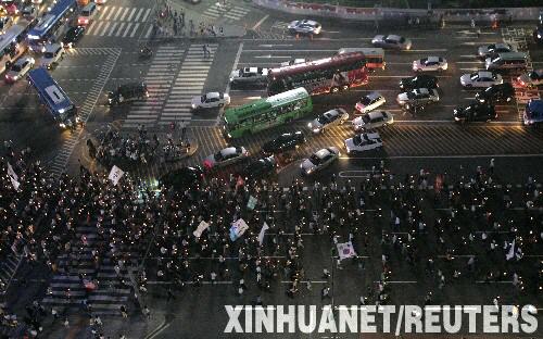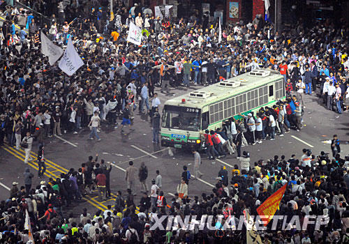 5月31日以來(lái),韓國(guó)民眾連續(xù)在首爾市中心舉行抗議示威集會(huì)活動(dòng),且規(guī)模越來(lái)越大,并伴有沖擊總統(tǒng)府、與警察發(fā)生沖突等過(guò)激暴力行為。8日早晨,從7日晚開(kāi)始燭光守夜集會(huì)活動(dòng)的抗議者再次與警察發(fā)生沖突。目前已有200多名示威者被捕,沖突造成約140人受傷。集會(huì)組織者“反瘋牛病人民聯(lián)盟”還發(fā)出傳單,號(hào)召民眾10日舉行百萬(wàn)人大集會(huì)。