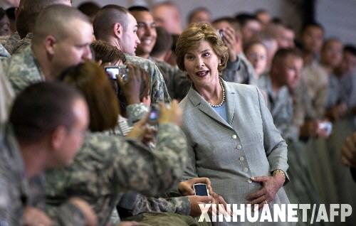 6月8日,在阿富汗巴格拉姆美軍基地,美國第一夫人勞拉·布什(中)與美軍士兵見面。布什夫人當日突訪阿富汗,呼吁國際社會不要放棄這個飽受戰(zhàn)爭、暴力摧殘的國家。 新華社/法新