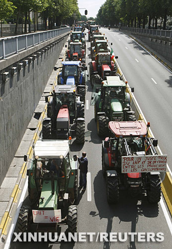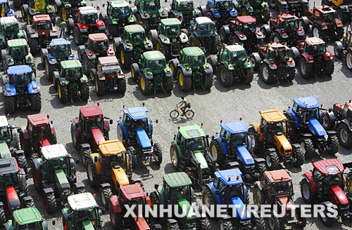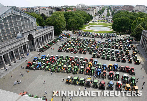 6月18日,比利時農(nóng)民將拖拉機駛?cè)胧锥疾剪斎麪柺兄行倪M行抗議!⌒氯A社/路透