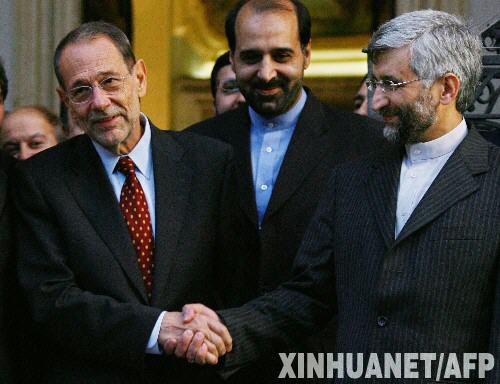 資料圖片:2007年10月23日,歐盟負(fù)責(zé)外交和安全事務(wù)的高級(jí)代表索拉納(左)與伊朗首席核談判代表賈利利(右)在意大利羅馬舉行會(huì)談前握手。 新華社/法新