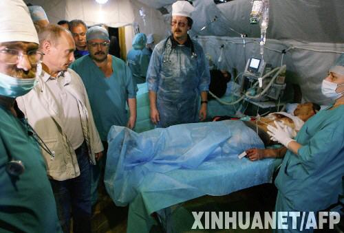 8月9日,在俄羅斯北奧塞梯共和國首府弗拉季高加索,俄總理普京(左二)來到野戰(zhàn)醫(yī)院看望在格魯吉亞南奧塞梯交火中受傷的傷員。普京于8日晚飛抵弗拉季高加索,召集會議討論南奧塞梯問題并會見了逃離南奧塞梯的難民。 新華社/法新