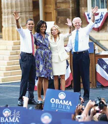 民主黨總統(tǒng)候選人奧巴馬(左)周六在斯普林菲爾德首次跟拜登(右)以競選拍檔身分一起拉票。奧巴馬夫婦跟拜登夫婦向支持者揮手致意。(香港明報圖)