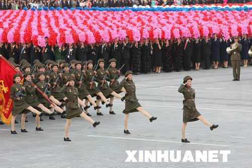 9月9日,閱兵式上的工農赤衛(wèi)隊女兵。朝鮮國防委員會、人民武力部和勞動黨平壤市委員會當日在平壤金日成廣場舉行工農赤衛(wèi)隊閱兵式,熱烈慶祝朝鮮建國60周年。新華社記者 張濱陽 攝