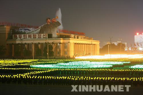 9月9日,朝鮮首都平壤金日成廣場上的火炬表演。朝鮮國防委員會、人民武力部和勞動黨平壤市委員會當日在平壤金日成廣場舉行工農赤衛(wèi)隊閱兵式,熱烈慶祝朝鮮建國60周年。新華社記者 張濱陽 攝