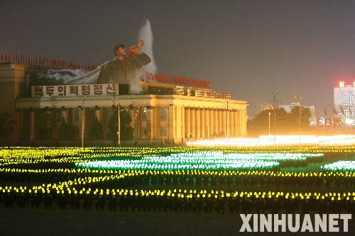 9月9日,朝鮮首都平壤金日成廣場上的火炬表演。朝鮮國防委員會、人民武力部和勞動黨平壤市委員會當日在平壤金日成廣場舉行工農(nóng)赤衛(wèi)隊閱兵式,熱烈慶祝朝鮮建國60周年。 新華社記者 張濱陽 攝