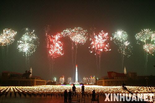 9月9日,在朝鮮首都平壤,大同江對岸燃放起焰火。朝鮮國防委員會、人民武力部和勞動黨平壤市委員會當日在平壤金日成廣場舉行工農(nóng)赤衛(wèi)隊閱兵式,熱烈慶祝朝鮮建國60周年。 新華社記者 張濱陽 攝