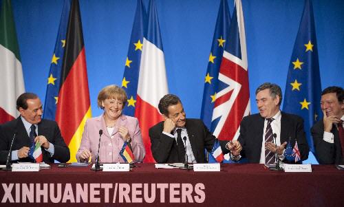 資料圖片 10月4日,意大利總理貝盧斯科尼、德國(guó)總理默克爾、法國(guó)總統(tǒng)薩科齊、英國(guó)首相布朗和歐盟委員會(huì)主席巴羅佐(從左至右)參加在法國(guó)首都巴黎的愛(ài)麗舍宮舉行的聯(lián)合記者招待會(huì)。當(dāng)日,法國(guó)、德國(guó)、英國(guó)和意大利的領(lǐng)導(dǎo)人在巴黎召開(kāi)會(huì)議,尋求共同應(yīng)對(duì)金融危機(jī)的對(duì)策。 新華社/路透