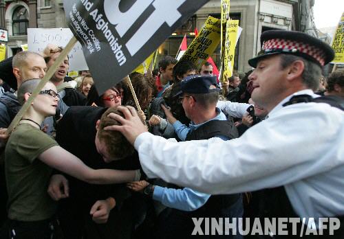 10月10日,在英國首都倫敦,參加反對救市示威游行的青年學(xué)生與警察發(fā)生沖突。一些倫敦市民和學(xué)生當(dāng)天在倫敦金融街舉行反對政府救市示威游行活動,并打出“反對資本家”、“我們?yōu)槭裁匆獮樗麄冎圃斓奈C(jī)埋單”等標(biāo)語。當(dāng)日倫敦股市出現(xiàn)大跳水,《金融時(shí)報(bào)》100種股票平均價(jià)格指數(shù)跌幅高為8.85%。 新華社/法新
