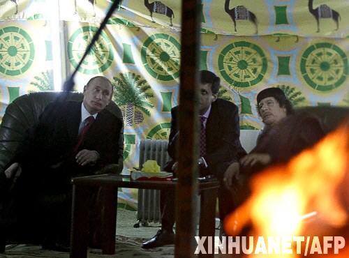 11月1日,俄羅斯總理普京(左一)來到利比亞領導人卡扎菲(右一)搭建在莫斯科克里姆林宮的貝都因人帳篷內會見卡扎菲?ㄔ茞圩づ竦牧晳T舉世聞名,他在出訪時往往攜帶一頂帳篷,作為他的旅居之所?ㄔ10月31日晚抵達莫斯科。 新華社/法新
