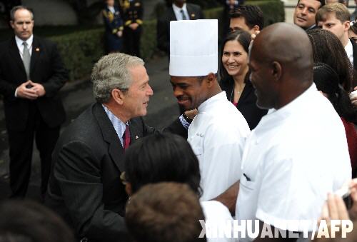 11月6日,美國總統(tǒng)布什(左)在華盛頓白宮南草坪與工作人員見面。美國總統(tǒng)布什當(dāng)日說,他將于10日和當(dāng)選總統(tǒng)奧巴馬在白宮會談,主要議題包括金融危機(jī)和伊拉克戰(zhàn)爭。 新華社/法新