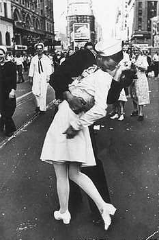 伊迪絲老太說,1945年8月15日,當(dāng)日本宣布投降后,她和數(shù)以萬計(jì)的群眾涌到紐約街上,熱烈慶祝。當(dāng)時(shí)群眾的情緒十分高漲,氣氛熱鬧。就在百老匯街和第45街的交界處,突然有一名水兵走上前攬 她的腰,與她深情接吻。整個(gè)過程被《生活》雜志攝記艾森施塔特拍下,成為一幅經(jīng)典照片。