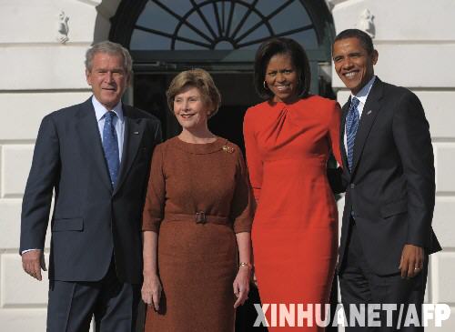 11月10日,美國(guó)當(dāng)選總統(tǒng)奧巴馬(右一)及其夫人米歇爾(右二)與美國(guó)現(xiàn)任總統(tǒng)布什(左一)及其夫人勞拉在美國(guó)白宮合影。奧巴馬當(dāng)日應(yīng)邀首次進(jìn)入白宮橢圓形辦公室會(huì)見(jiàn)布什,就經(jīng)濟(jì)危機(jī)和伊拉克戰(zhàn)爭(zhēng)等問(wèn)題舉行會(huì)談,以確保政府順利過(guò)渡。 新華社/法新