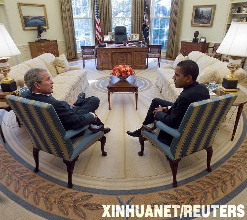 11月10日,美國(guó)當(dāng)選總統(tǒng)奧巴馬(右)應(yīng)邀首次進(jìn)入白宮橢圓形辦公室會(huì)見(jiàn)現(xiàn)任總統(tǒng)布什,就經(jīng)濟(jì)危機(jī)和伊拉克戰(zhàn)爭(zhēng)等問(wèn)題舉行會(huì)談,以確保政府順利過(guò)渡。 新華社/路透