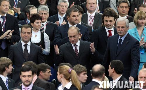 11月20日,俄羅斯總統(tǒng)梅德韋杰夫(中左)、俄總理普京(中)與俄國(guó)家杜馬(議會(huì)下院)主席格雷茲洛夫(中右)共同步入會(huì)場(chǎng)。當(dāng)日,統(tǒng)一俄羅斯黨在莫斯科召開(kāi)第十次代表大會(huì)。新華社記者沈伯韓攝