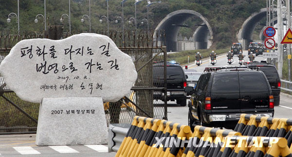 這是2007年10月3日韓國前總統(tǒng)盧武鉉的車隊穿過軍事分界線的資料照片。 11月12日,朝韓將軍級會談朝鮮代表團團長正式通知韓國軍方,將從12月1日起采取“重大的實際措施”,切斷經(jīng)由朝鮮半島軍事分界線的所有陸路通道,嚴格限制通行。 新華社/法新