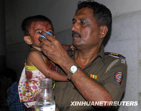 11月26日,一名警察在印度孟買(mǎi)一所醫(yī)院安撫一名在襲擊中受傷的兒童。新華社/路透