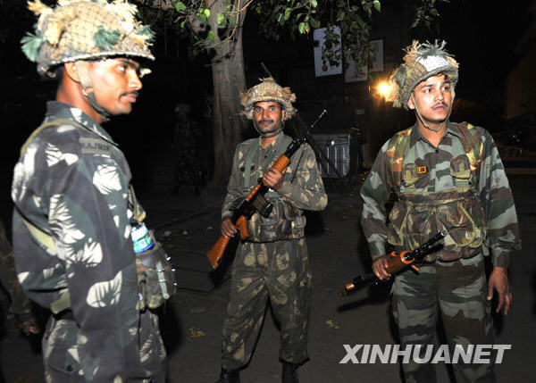11月27日晚,印度特種部隊士兵在奧貝羅伊酒店外警戒。新華社記者 王曄攝