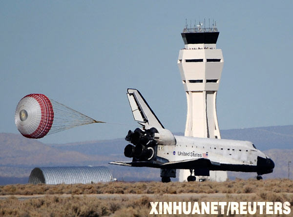 美國(guó)西部時(shí)間30日13時(shí)25分左右(北京時(shí)間12月1日5時(shí)25分左右),位于洛杉磯以北160公里的愛(ài)德華茲空軍基地晴空萬(wàn)里,“奮進(jìn)”號(hào)航天飛機(jī)拖著橙色降落傘順利降落在機(jī)場(chǎng)跑道上。